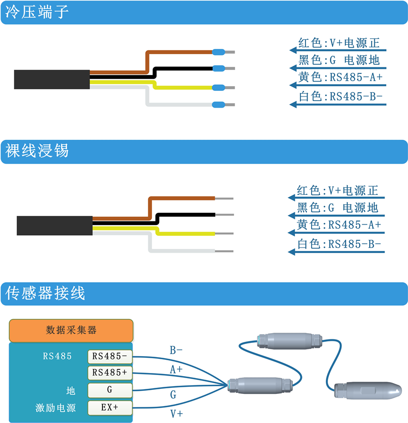 传感器支持SDI-12接口或RS485接口(Modbus-RTU协议),兼容多种支持SDI-12以及RS485通信的数据采集器,进行远距离多点监测与记录。
