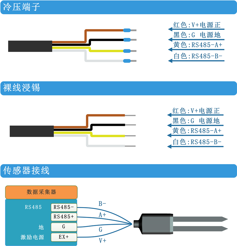 产品系列: MT05R系列传感器; 测量参数: 土壤水分、温度、电导率测量; 供电电源: 3.0-28V DC; 输出接口: RS485(Modbus-RTU); 线缆接头: 冷压端子; 线缆长度: 2米; |